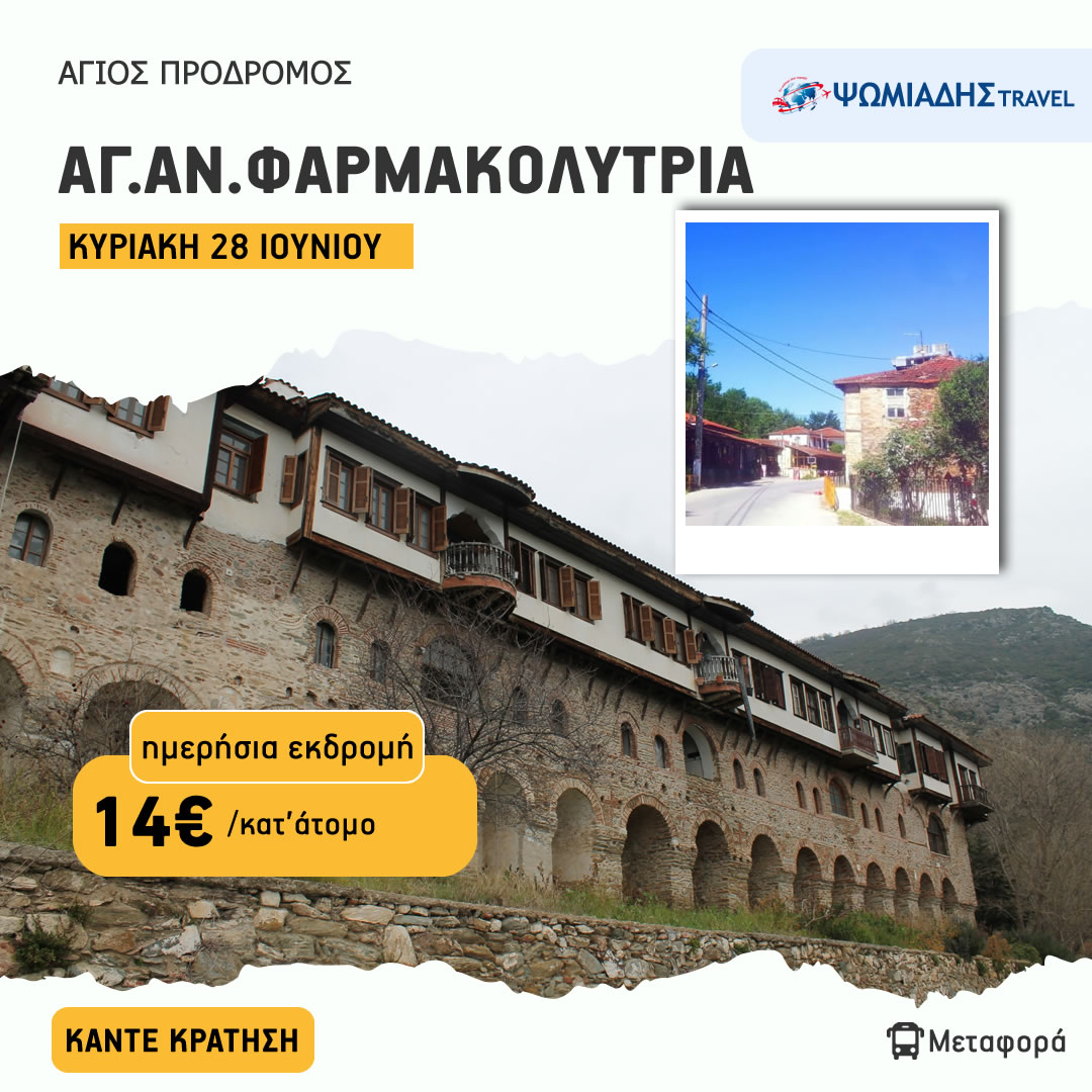 Συγκέντρωση στο γραφείο μας στις 08.00 και αναχώρηση για την Ιερά Μονή Αγίας Αναστασίας Φαρμακολύτριας. Προσκύνημα και συνεχίζουμε για το χωριό Άγιος Πρόδρομος.