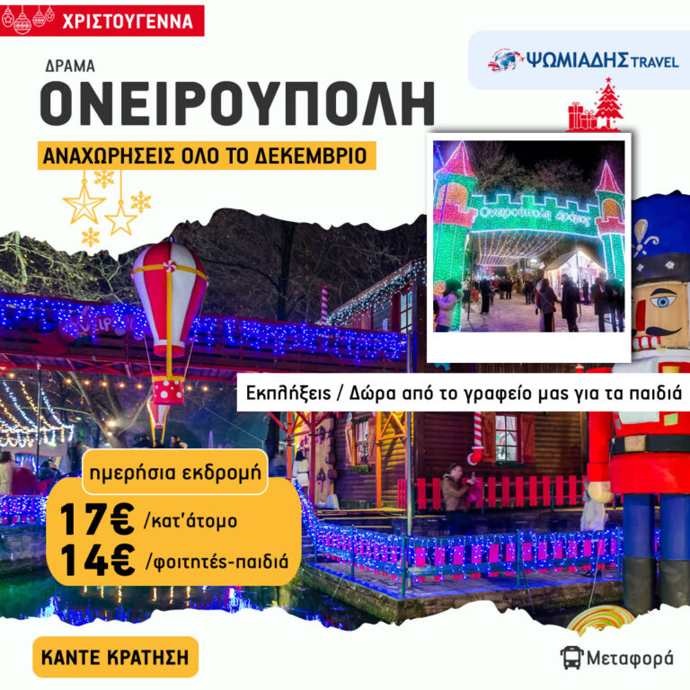 Αναχώρηση από το γραφείο μας στις 09:00 με προορισμό τα Τρίκαλα. Όπως τόσα χρόνια, έτσι και φέτος ο Μύλος Ματσόπουλου τέτοιες ημέρες μεταμορφώνεται στο μεγαλύτερο Χριστουγεννιάτικο, θεματικό πάρκο! Φέτος υποδέχεται τον Πίτερ Παν, την Τίνκερμπελ, τον κάπτεν Χουκ,τη Γουέντι, στη «Χώρα του Ποτέ»! Μπορείτε να απολαύσετε μια μοναδική εμπειρία με παιχνίδια, δραστηριότητες, κατασκευές, φαγητό κ.α.