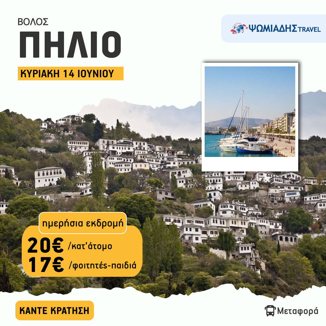 Αναχώρηση από το γραφείο μας στις 08:00. Με καθ’ οδόν στάση στη Λάρισα, φτάνουμε στη γραφική Μακρυνίτσα, χαρακτηρισμένη ως “μπαλκόνι του Βόλου” όπου θα έχουμε την ευκαιρία να πιούμε τον καφέ μας, ανάμεσα σε γέρικα πλατάνια και λουλουδιασμένους κήπους. Αναχώρηση για την πρωτεύουσα της Μαγνησίας, τον όμορφο Βόλο, φωλιασμένο στον μυχό του Παγασητικού κόλπου. Χρόνος ελεύθερος για φαγητό και ξεκούραση.